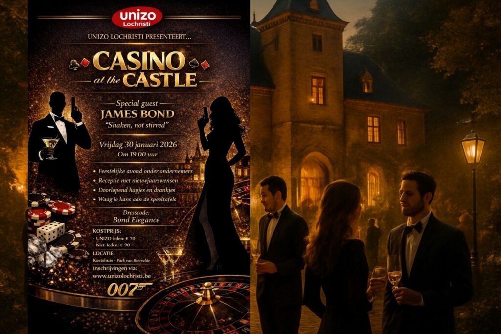 Op vrijdag 30 januari zet Unizo Lochristi 2026 in op sprankelende en stijlvolle wijze. Ze nodigen ondernemers, partners en sympathisanten uit voor een stijlvolle nieuwjaarsreceptie met als thema “Casino at the Castle”. De Bond-Elegance dresscode, de verfijnde hapjes & drankjes én de speeltafels die de spanning erin houden, maken het helemaal af.