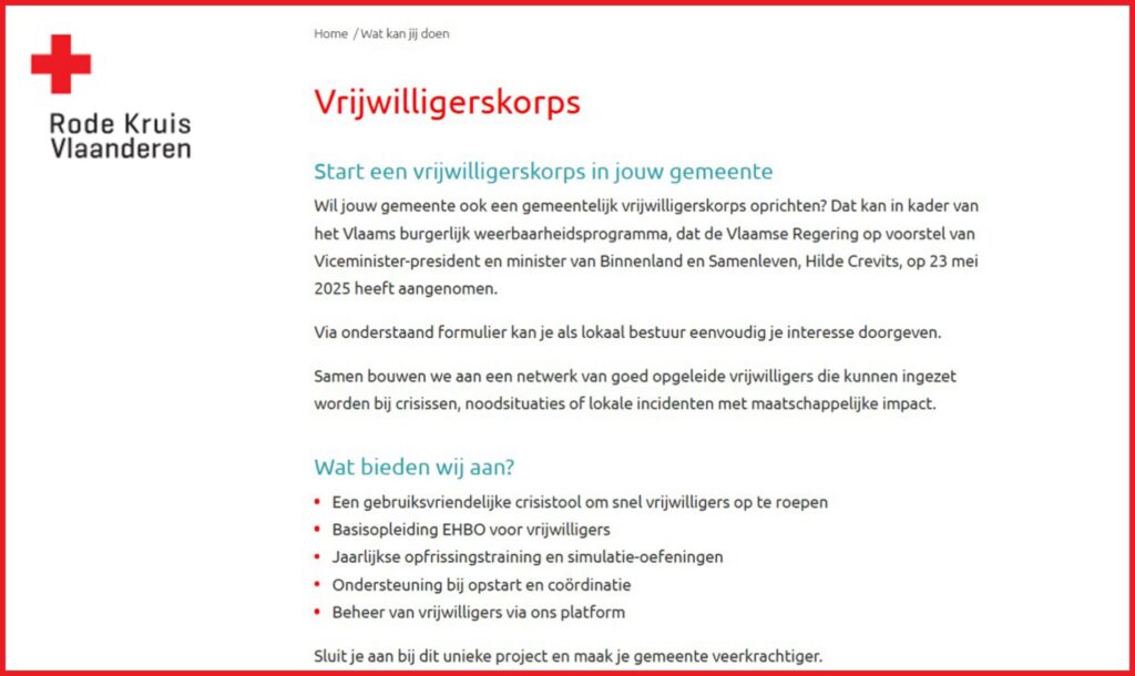 De vrijwilligerskorpsen zijn eigenlijk een initiatief van de Vlaamse Regering die in mei vorig jaar een akkoord rond de gemeentelijke vrijwilligerskorpsen in het kader van het Vlaams Defensieplan bereikte. Dergelijk vrijwilligerskorps zou kunnen ingezet worden bij lokale nood- of crisissituaties zoals stormschade, overstromingen, hittegolven of verstoring van de basisdiensten.